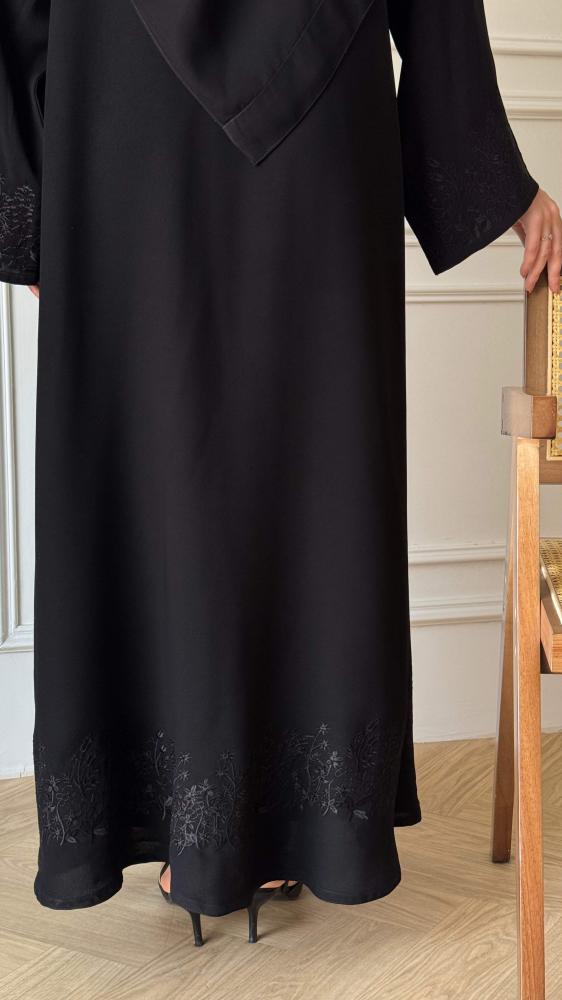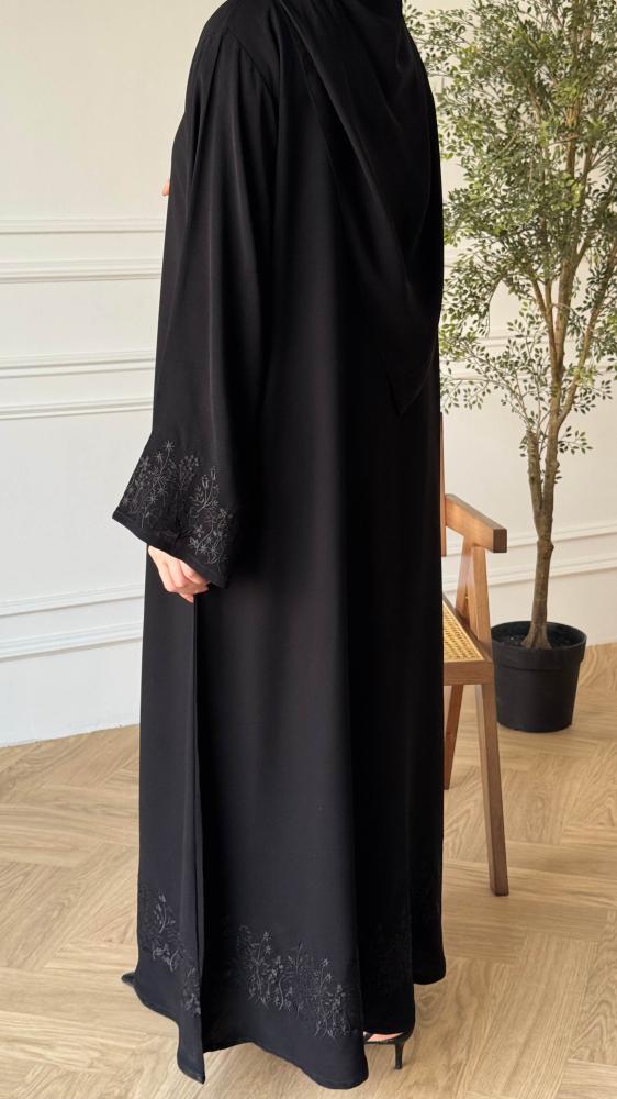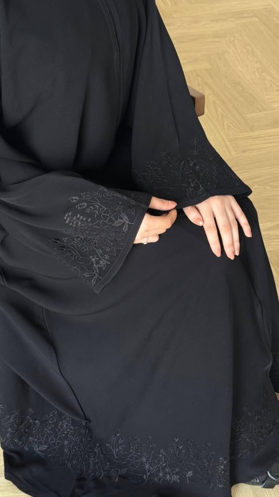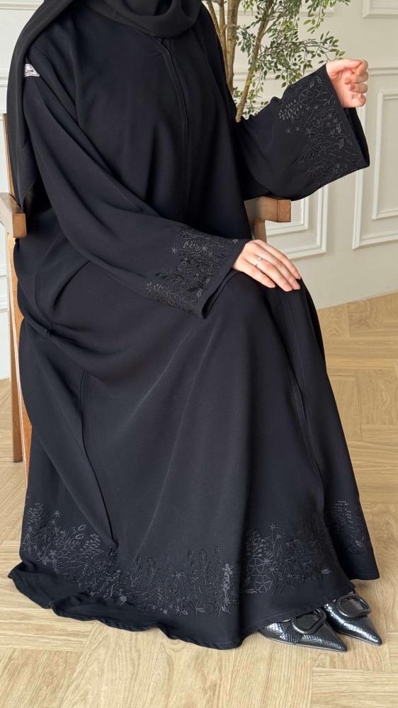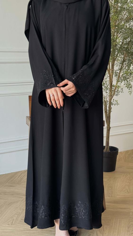 القماش : كريب ملكي قماش انسيابي أنيق وتطريز اسود في الكم واسفل العباية .