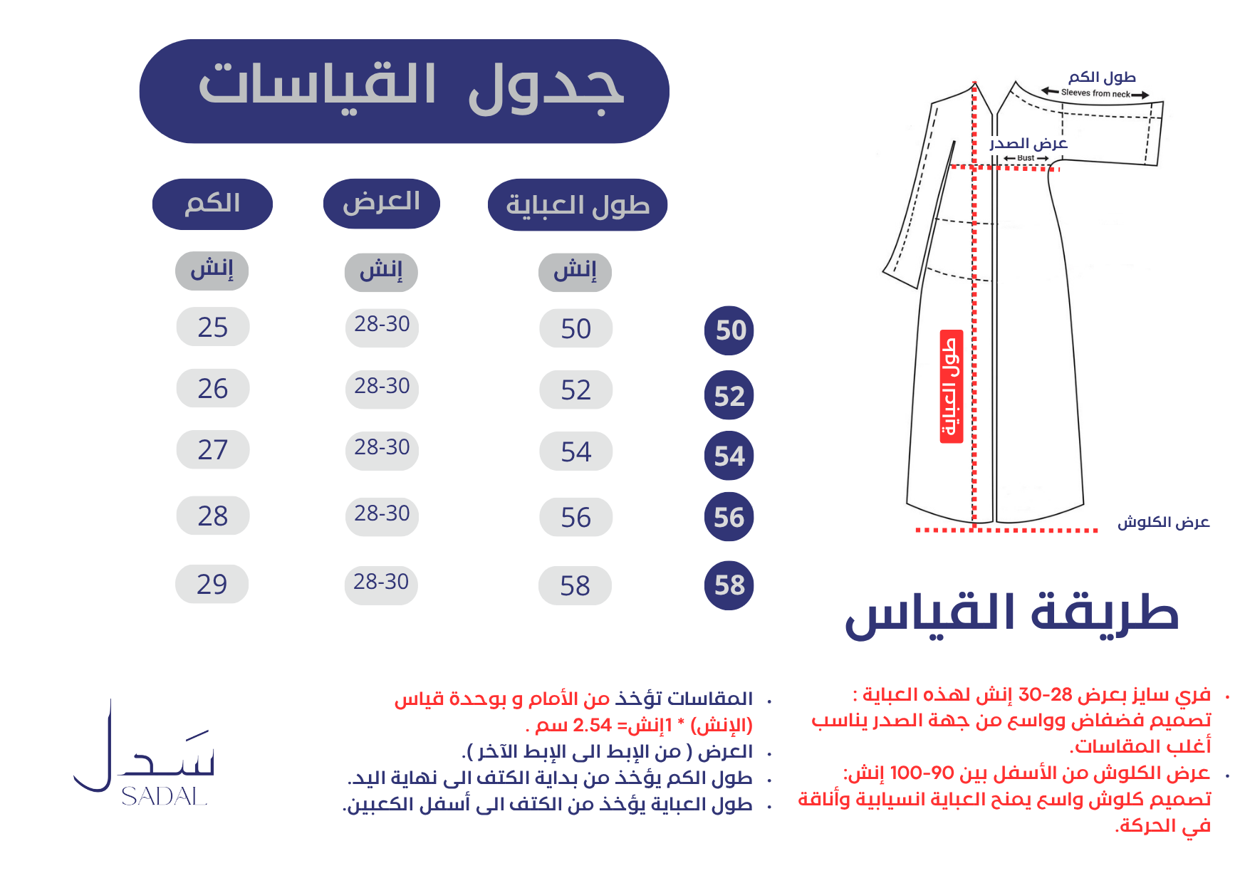 - فري سايز العرض بين 28-30 إنش لهذه العباية.