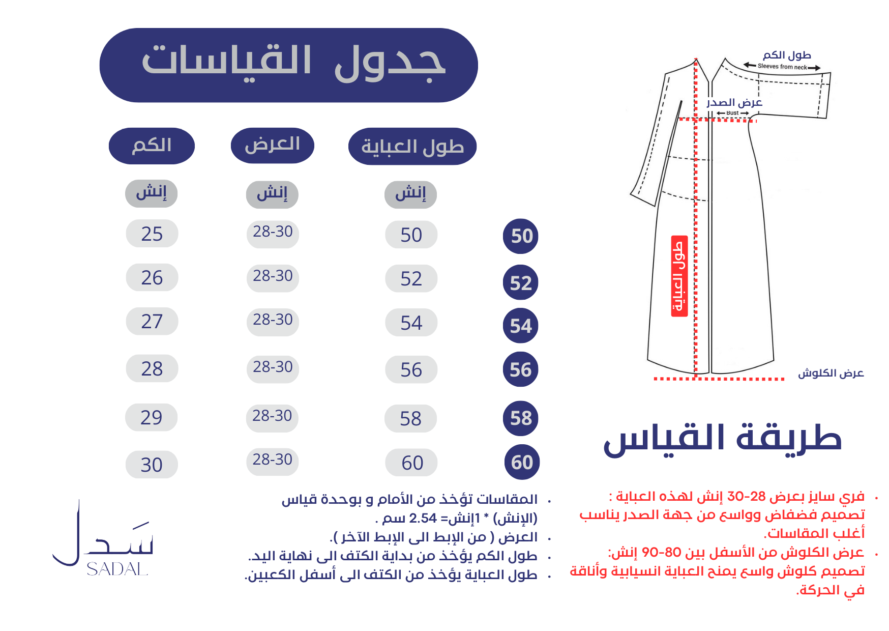 • فري سايز العرض بين 28-30 إنش لهذه العباية.