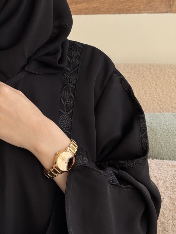 • الملحقات : يوجد معها طرحة ساده بطرف من نفس قماش العباية