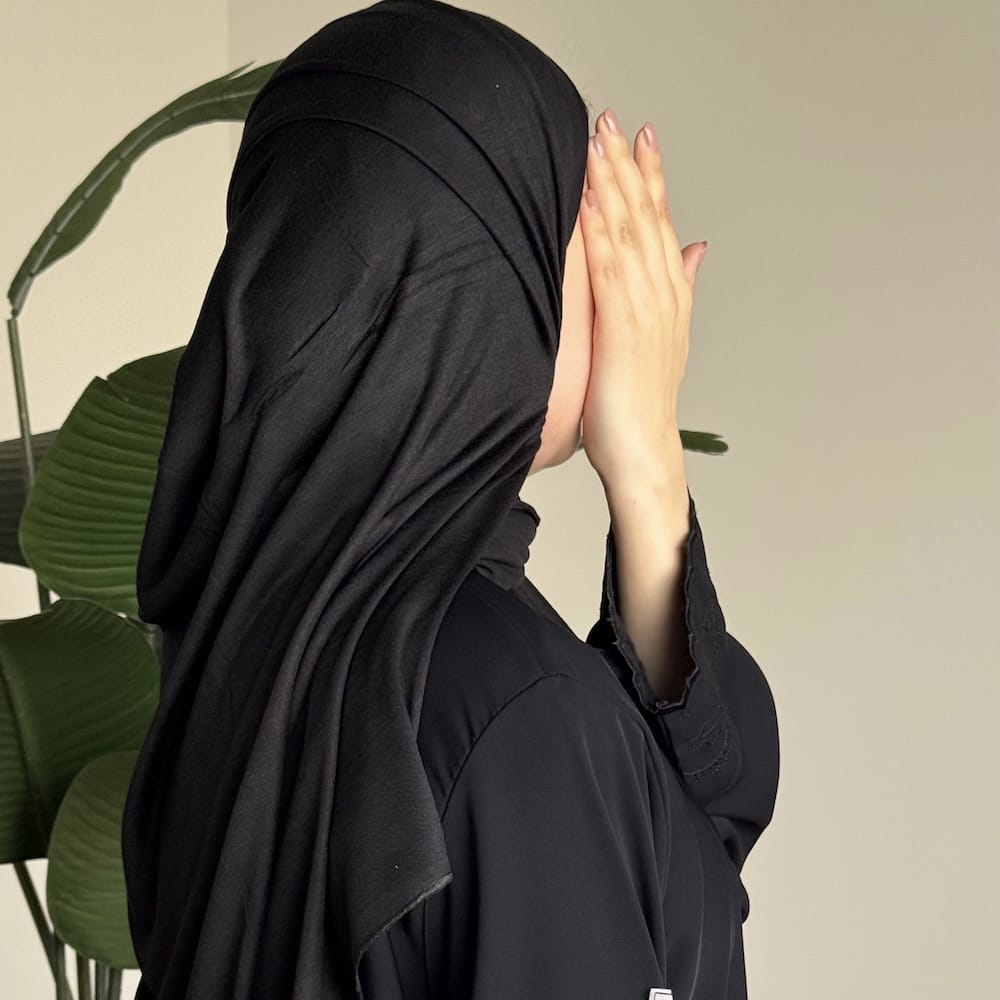 اجعلي إطلالتكِ بسيطة وأنيقة في نفس الوقت مع طرحة أسود سادة من قماش فاخر