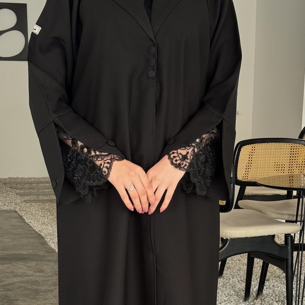 كما أن العباية مصنوعة من قصة الربع كلوش التي تجعل حركتكِ أسهل والدانتيل هنا مضاف بطريقة عملية، حيث تم إضافته من الداخل ليبدو بمظهر أفضل خاصًة مع الأزرار الموجودة في الأكمام ويضفي إليها لمسة فخمة.