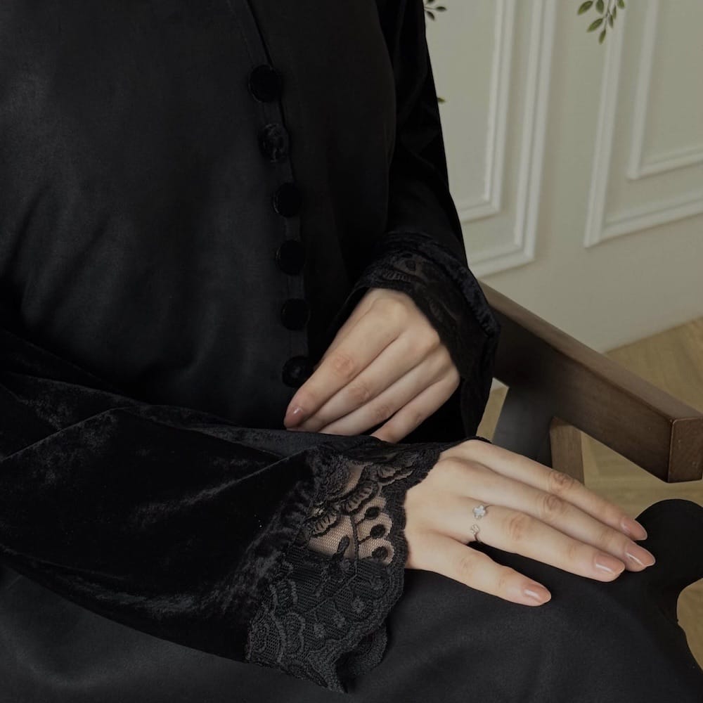 أضيفي لمسة من الجمال إلى إطلالتكِ الشتوية مع عباية دانتيل مخمل